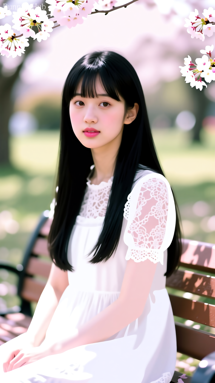 一位18岁的亚洲少女,黑色长直发及腰,空气刘海,杏仁眼,清透妆容,浅粉色唇彩,身穿白色蕾丝连衣裙,坐在开满樱花的公园长椅上,春天午后,阳光透过花瓣洒下斑驳光影,柔和的自然光,浅景深虚化背景,日系胶片色调,Canon EOS R5, 85mm f/1.2,超精细皮肤质感,8k分辨率